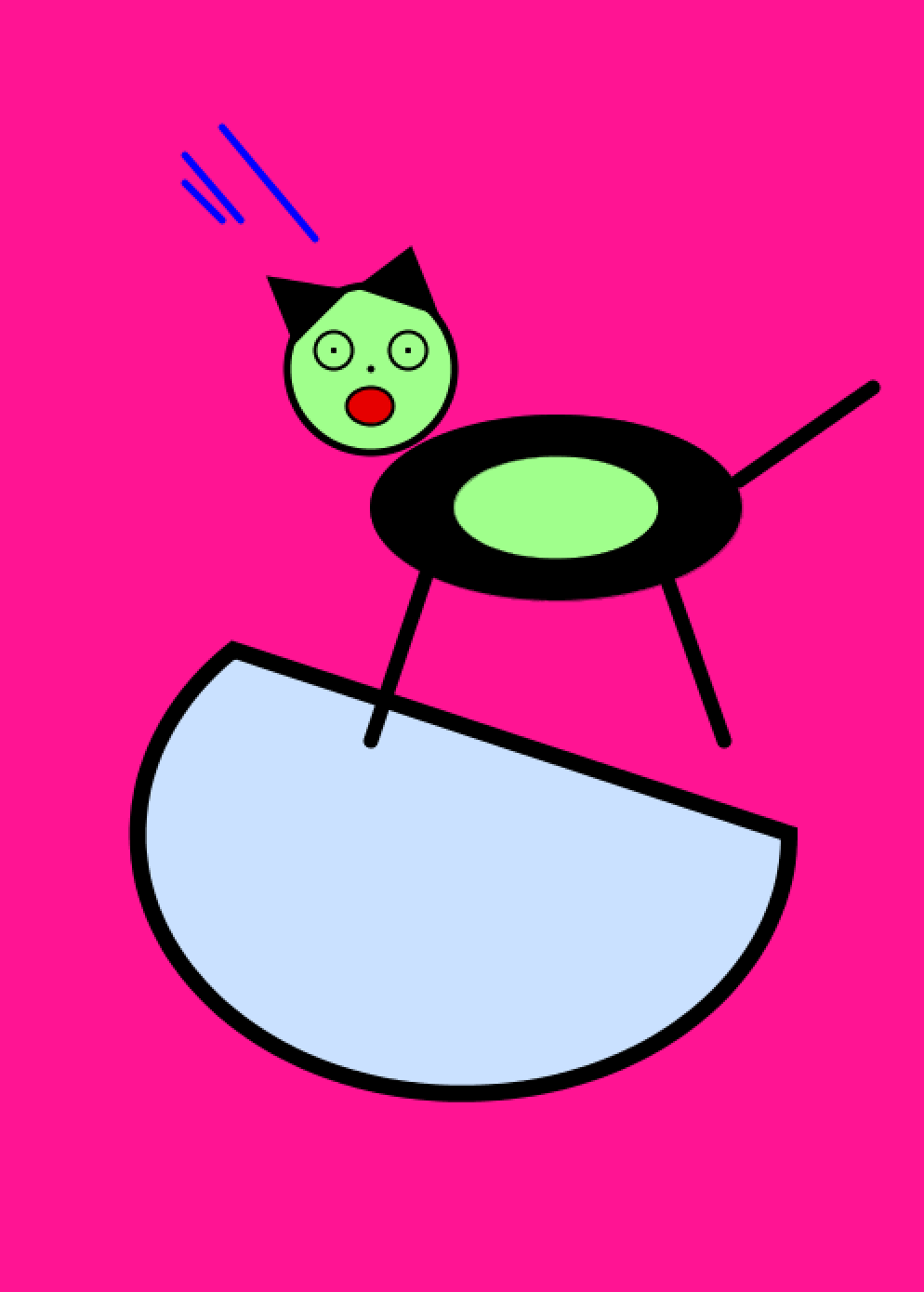 println("Yael,prompt: A desperate animal");size(500,700); background(255,20,147); println("head"); strokeWeight(4); fill(160,255,140); ellipse(200,200,90,90); ellipseMode(CENTER); println("water bowl"); strokeWeight(9); fill(202,225,255); arc(250, 450, 350, 280, 0, PI+QUARTER_PI, CHORD); println("face"); strokeWeight(3); point(180,190); point(220,190); strokeWeight(4); point(200,200); fill(230,0,0); strokeWeight(2); ellipse(200,220,25,20); noFill(); ellipse(180,190,20,20); ellipse(220,190,20,20); println("ears"); fill(0,0,0); strokeWeight(0); ellipse(300,275,200,100); fill(160,255,140); ellipse(300,275,110,55); fill(230,130,90); println("tail"); stroke(0,0,0); strokeWeight(8); line(398,260,470,210); println("ears"); fill(0,0,0); strokeWeight(8); triangle(160, 180, 150, 155, 180, 160); triangle(230, 165, 200, 155, 220, 140); println("legs"); stroke(0,0,0); strokeWeight(8); line(390,400,360,315); print("leg2"); stroke(0,0,0); strokeWeight(8); line(200,400,230,310); println("wind"); stroke(0,0,255); strokeWeight(4); line(100,100,120,120); line(130,120,100,85); line(120,70,170,130);