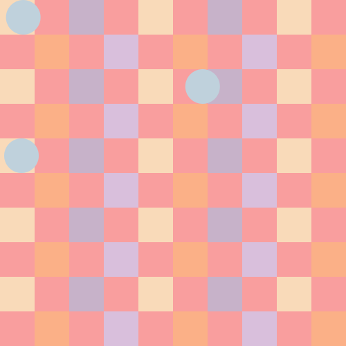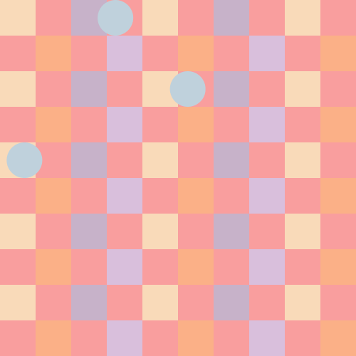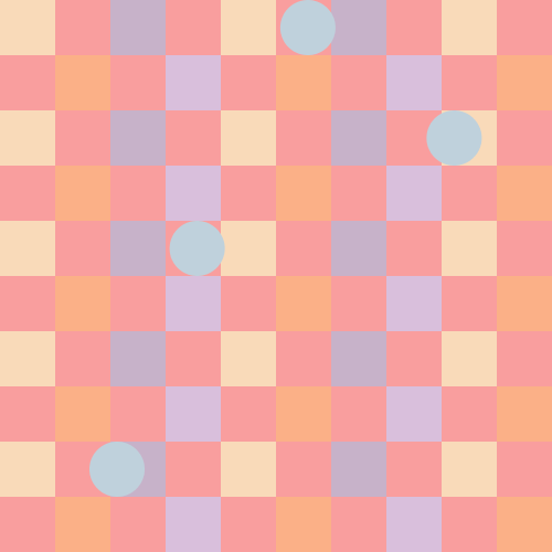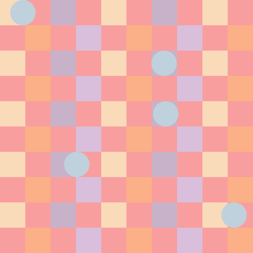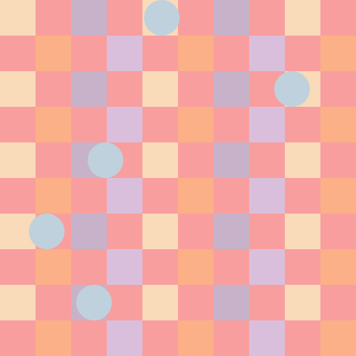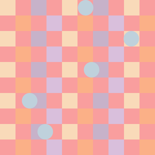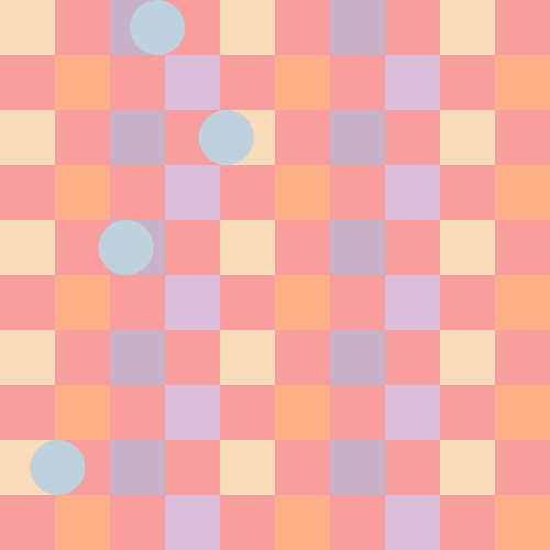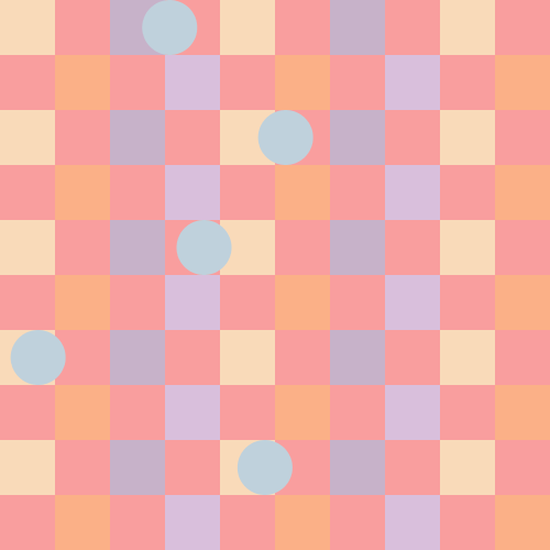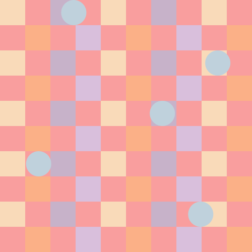 void setup(){ size(500, 500); smooth(); frameRate(10); } void draw(){ int c = 50; color color_one = color(249,218,185); color color_two = color(199,178,201); color color_three = color(251,176,135); color color_four = color(217,191,220); color color_five = color(191,209,220); background(249,158,158); for (int x = 0; x <= 450; x += 50) { for (int y = 0; y <= 450; y += 50) { fill(color_one); noStroke(); rect(x*2,y*2,c,c); } } for (int x = 50; x <= 450; x += 100) { for (int y = 0; y <= 450; y += 50) { fill(color_two); noStroke(); rect(x*2,y*2,c,c); } } for (int x = 25; x <= 450; x += 50) { for (int y = 50; y <= 450; y += 100) { fill(color_three); noStroke(); rect(x*2,y,c,c); } } for (int x = 75; x <= 450; x += 100) { for (int y = 50; y <= 450; y += 100) { fill(color_four); noStroke(); rect(x*2,y,c,c); } } translate(random(0, 350), random(0, 0)); for (int x = 25; x <= 450; x += 500) { for (int y = 25; y <= 450; y += 500) { fill(color_five); noStroke(); ellipse(x, y, c, c); } } translate(random(0, 350), random(50, 50)); for (int x = 75; x <= 450; x += 500) { for (int y = 75; y <= 450; y += 500) { fill(color_five); noStroke(); ellipse(x, y, c, c); } } translate(random(-350, 0), random(75, 75)); for (int x = 100; x <= 450; x += 500) { for (int y = 100; y <= 450; y += 500) { fill(color_five); noStroke(); ellipse(x, y, c, c); } } translate(random(-350, 0), random(100, 100)); for (int x = 100; x <= 450; x += 500) { for (int y = 100; y <= 450; y += 500) { fill(color_five); noStroke(); ellipse(x, y, c, c); } } translate(random(0, 350), random(100, 100)); for (int x = 100; x <= 450; x += 500) { for (int y = 100; y <= 450; y += 500) { fill(color_five); noStroke(); ellipse(x, y, c, c); } } }